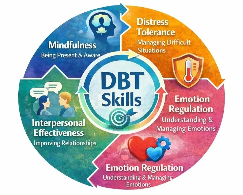 DBT looks at biological (genetic, physical), psychological (thoughts, emotions) and social (environmental, cultural) factors that limit a person’s ability to accept and change their current situation and provides skills or different perspectives to move towards established goals